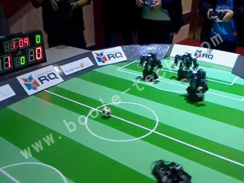 機器人足球比賽是一個互動性很強的環節,同學們可以遙控機器人行走、踢球、撲球、甚至跌到了,還會迅速爬起來繼續作戰!現場不斷傳出一陣陣的歡呼聲。