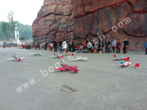隨后無人戰(zhàn)機(jī)編隊(duì)從地球村大門飛臨游客們的頭頂,在上方盤旋飛舞,做出各種特技飛行,引起孩子們一陣陣的驚嘆。