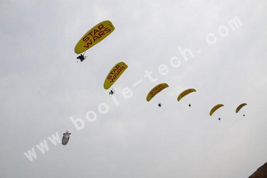 無人機(jī)退場后,一輛熱氣球飛艇和一組背著動力傘的“星球戰(zhàn)士”隨之飛抵現(xiàn)場,而同時,另一組“星球戰(zhàn)士”手拉繩索從天而降。