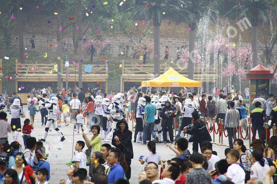 他們手持水槍,發(fā)起了對地面的人群發(fā)起攻擊,《星球大戰(zhàn)》由此拉開大幕。而孩子們也不甘示弱,他們也拿上自己的最新武器——水槍,勇敢的進(jìn)行反擊。