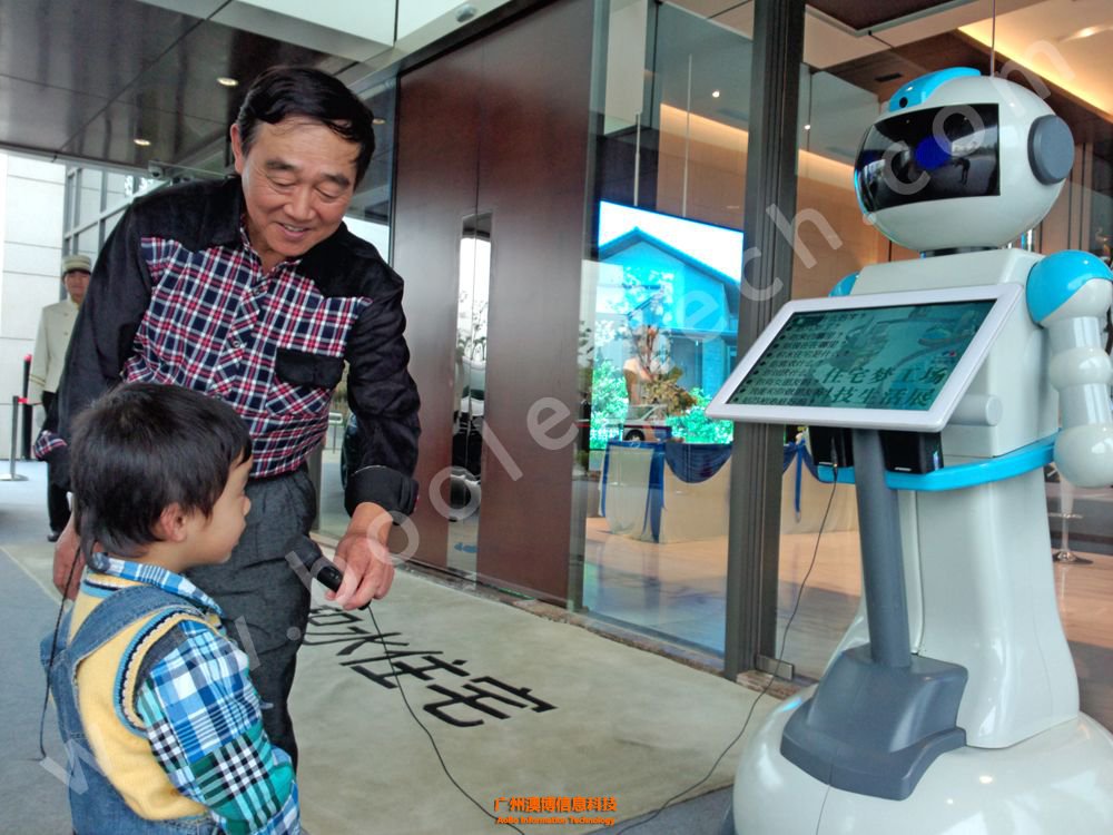 隨著游客們到來,迎賓機器人就會主動上前打招呼,問候大家。它的胸前有一塊觸摸屏,游客們可以通過屏幕與機器人互動,瀏覽房地產(chǎn)的相關(guān)介紹資料。